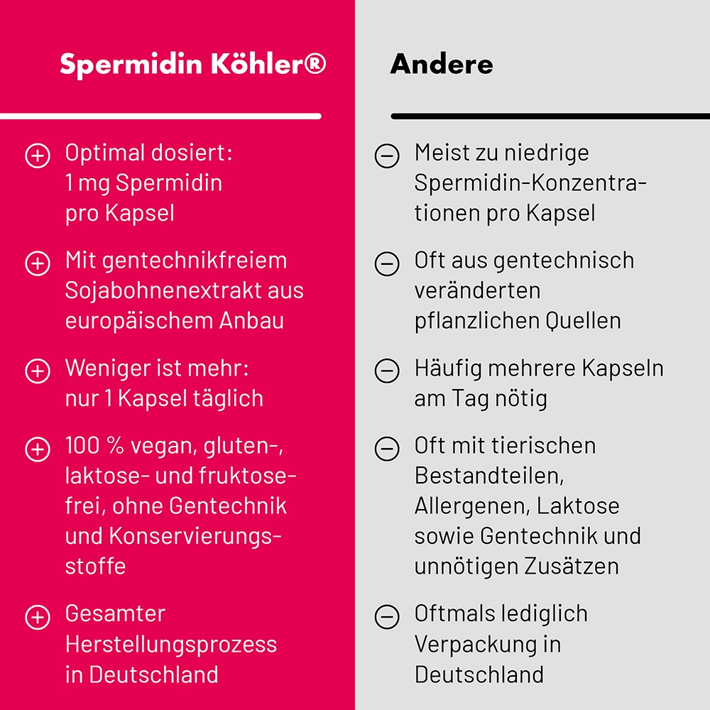 Spermidin Köhler® enthält einen Extrakt aus gentechnikfreien Sojabohnen europäischen Anbaus und ermöglicht eine ergänzende Versorgung mit Spermidin auf einfache und sichere Weise. Da Sojabohnenextrakt gegenüber anderen pflanzlichen Quellen einen relativ hohen natürlichen Anteil an Spermidin aufweist, wird dem Körper bereits durch 1 Kapsel Spermidin Köhler® 1 mg Spermidin zugeführt.