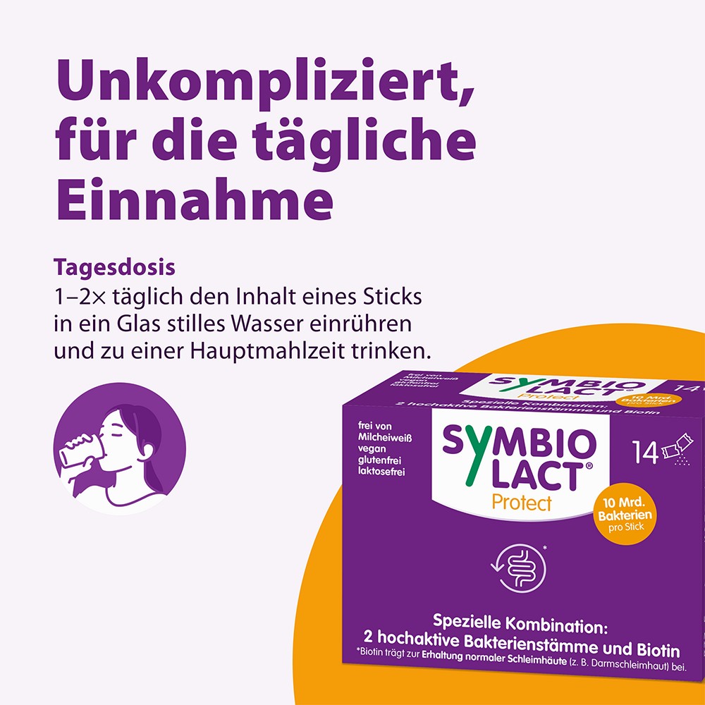 SymbioLact® protect enthält 30,0 µg Biotin pro Beutel, welches zur Erhaltung normaler Schleimhäute beiträgt. Zusätzlich enthält SymbioLact® protect zwei Stämme Milchsäure bildender Bakterien: