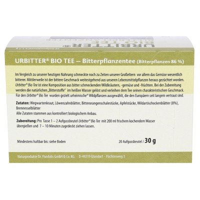 Urbitter® Bio Tee ist eine Komposition aus bitter schmeckenden Wildkräutern,-gemüse und-früchten, die den Europäern seit langem vertraut sind. Bei der Zubereitung werden die natürlichen Bitterstoffe im heißen Wasser gelöst und verleihen dem Tee seinen charakteristischen Geschmack.Verzehrempfehlung