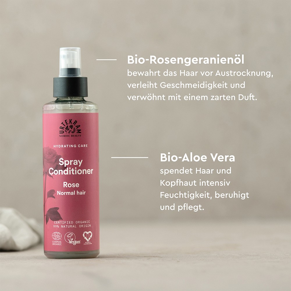 Der zart duftende Rose Spray Conditioner ist eine hydratisierende Leave-In Pflege für geschmeidig glänzendes Haar und leichte Kämmbarkeit. Bio-Aloe Vera, Hyaluron, Damaszener Bio-Rosenblütenwasser und Bio-Rosenblütenextrakt versorgen das Haar intensiv mit Feuchtigkeit. Beruhigendes Bio-Rosengeranienöl und schützender Magnolienrindenextrakt bewahren vor Austrocknung.