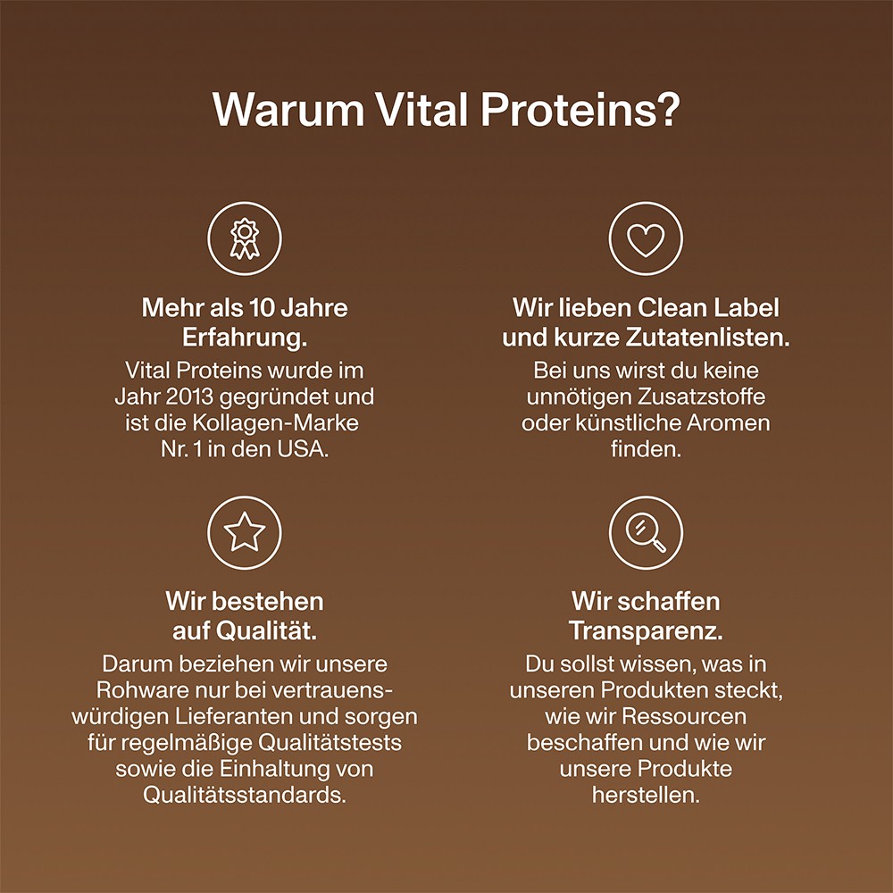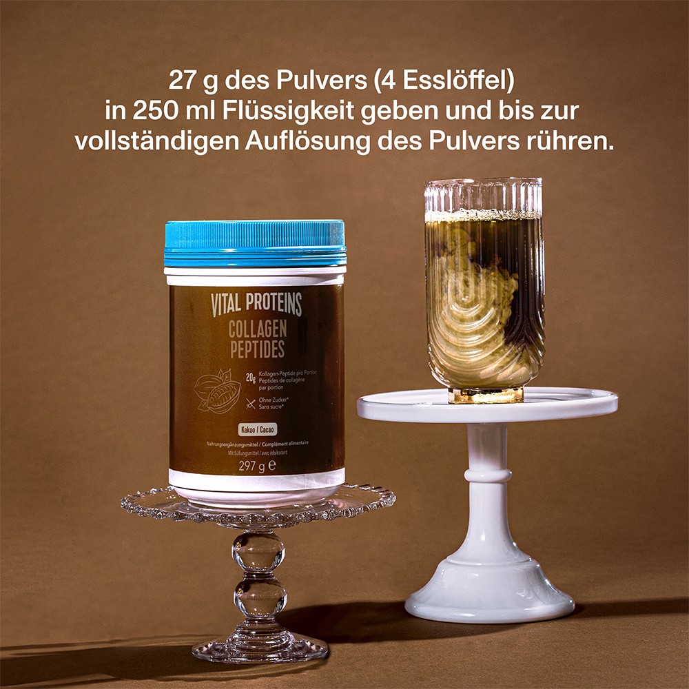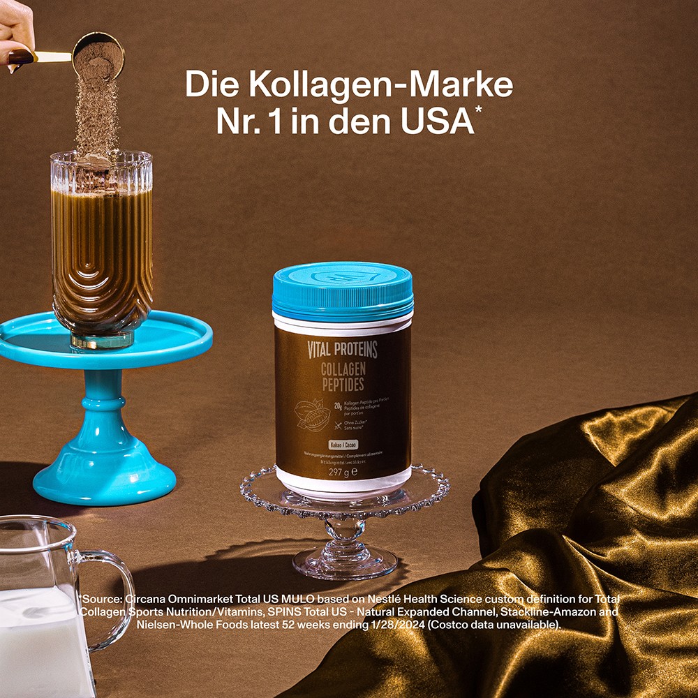 Nahrungsergänzungsmittel mit Kollagen-Peptiden. Geschmacksneutral/Nicht aromatisiertErlebe genussvolle Wellness-Momente mit Vital Proteins Collagen Peptides Kakao. Die Kollagen-Peptide lassen sich problemlos in kalte oder warme Flüssigkeiten einrühren und schmecken dabei himmlisch nach Kakao. Ob im Smoothie, Kakao-Shake oder Porridge - Nimm dir Zeit für deine Wohlfühl-Routine und genieße unser Collagen Peptides Kakao in deinem Lieblings-Getränk oder –Speise.