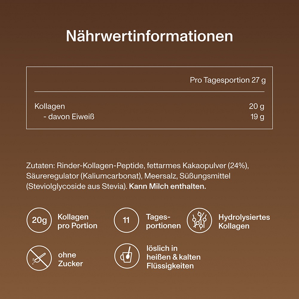 – bioaktive Kollagen-Peptide Typ 1 und 3 – reines Kollagen-Hydrolysat mit echtem Kakaopulver - ohne Zucker