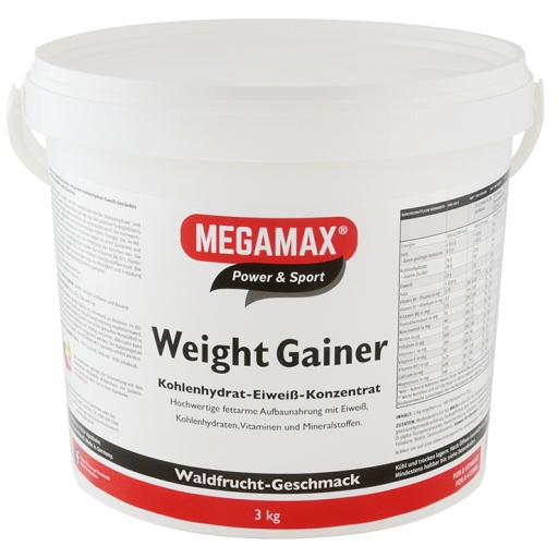 MEGAMAX Weight Gainer ist eine wohlschmeckende, fettarme und leicht verzehrbare Aufbaunahrung mit ca., 76 % Kohlenhydraten, 22% Protein – angereichert mit Vitaminen und Mineralstoffen, die für eine optimale Verstoffwechselung der Nährstoffe sorgen.