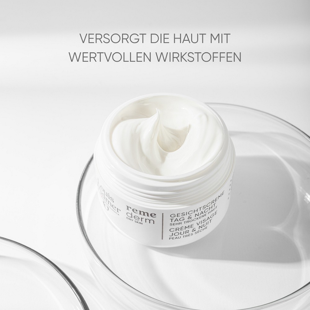 Die remederm Gesichtscreme Tag & Nacht wird morgens und abends auf die gereinigte Haut aufgetragen. Als Zusatzbehandlung bei sehr trockener, gereizter oder geröteter Körperhaut empfehlen wir die Pflegeprodukte aus der remederm Linie.