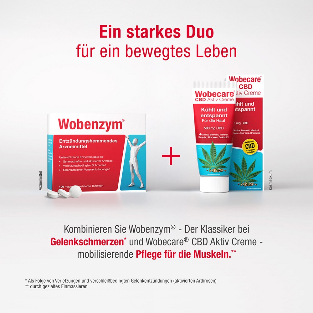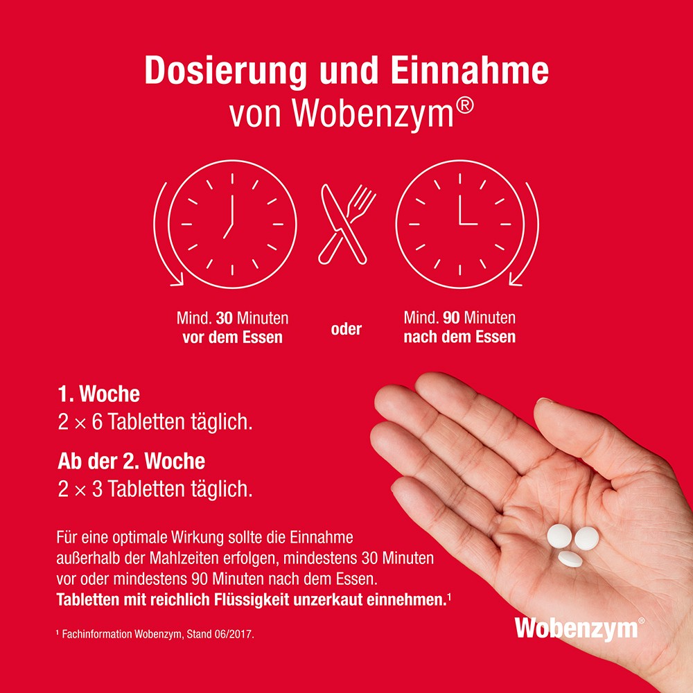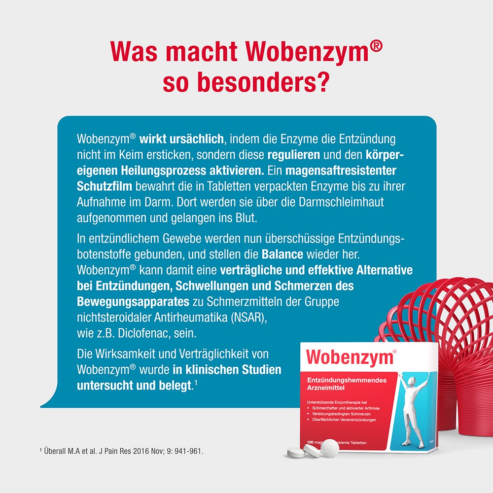 Die bewährte Enzymkombination aktiviert so die Selbstheilung, baut die Entzündung ab und reduziert so die Schmerzen. Wobenzym® basiert auf Enzymen und Wirkstoffen natürlichen Ursprungs und ist gut verträglich. Daher eignet es sich auch als Langzeittherapie, z.B. bei chronischen Erkrankungen.