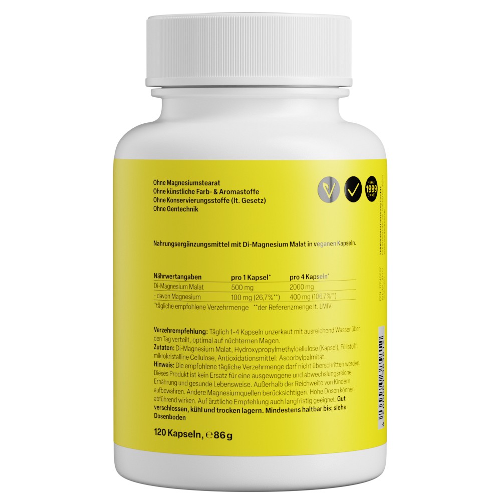 • 400 mg Magnesium pro Tagesportion: Hohe Dosierung als Di-Magnesium-Malat, rein pflanzlich und besonders bioverfügbar.