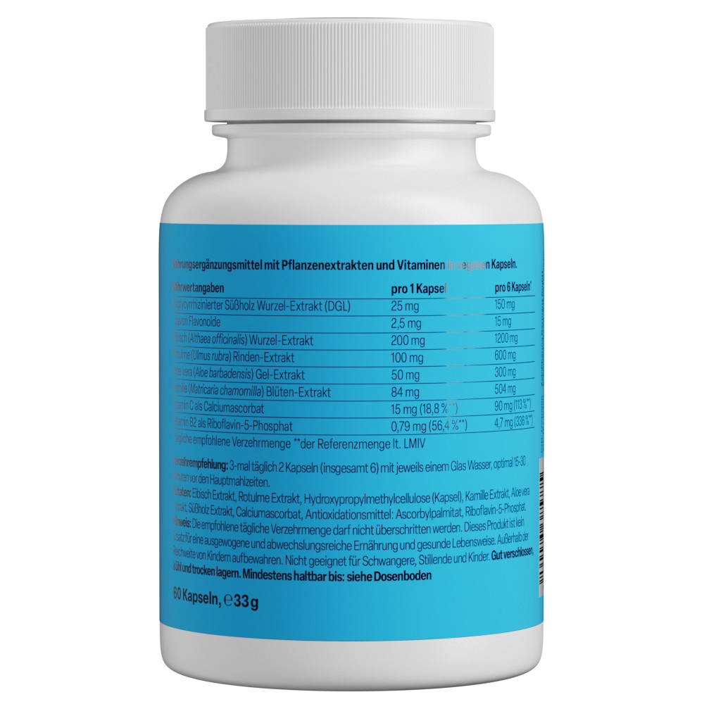 - Synergistische Pflanzenkraft – Enthält eine speziell abgestimmte Kombination aus Eibisch, Rotulme, Aloe Vera, Kamille und DGL-Extrakt für eine ganzheitliche Unterstützung des Verdauungstrakts.