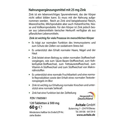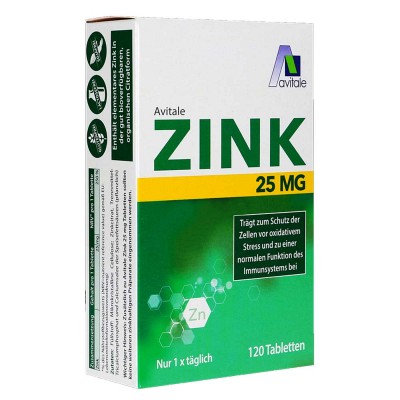 Zusätzlich zu Avitale Zink 25 mg Tabletten sollten keine weiteren zinkhaltigen Präparate eingenommen werden.Die tägliche Verzehrempfehlung darf nicht überschritten werden. Nahrungsergänzungsmittel sind kein Ersatz für eine ausgewogene und abwechslungsreiche Ernährung und gesunde Lebensweise. Bitte außerhalb der Reichweite von kleinen Kindern aufbewahren.